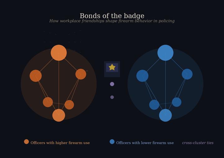 Firearm use spreads through officers’ informal friendships. Because these relationships often develop through shared assignments and transfers, organizational decisions can unintentionally shape where higher-risk behaviors cluster. Departments can proactively address this by pairing officers with colleagues who model restraint, rotating assignments to prevent clusters of firearm-prone officers, and foster mentorships that reinforce accountability. Managing who works and socializes together can help curb risky norms and reduce firearm use.