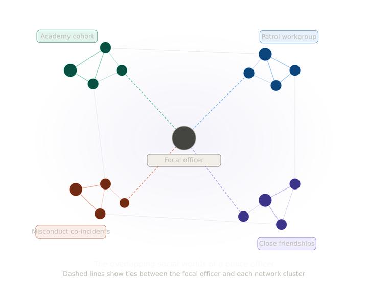 In policing, ties can come from many sources: officers may attend the academy together, work on the same shift, respond to the same calls, or form close friendships inside work. Each type of relationship captures a different layer of the organization, and choosing which layer has real consequences for what gets seen.